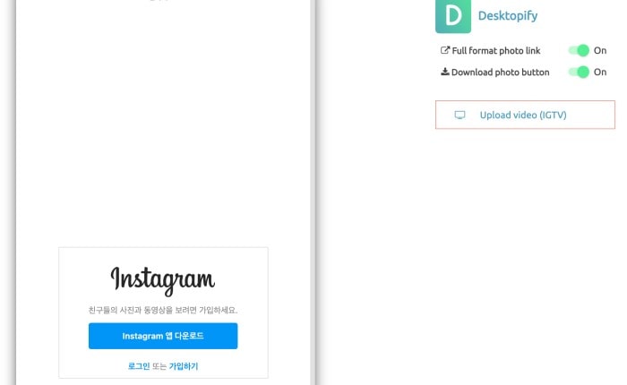 왼쪽에서는 인스타그램 계정 로그인 화면이 나타나고 오른쪽엔 Desktopify의 옵션이 표시됩니다.
